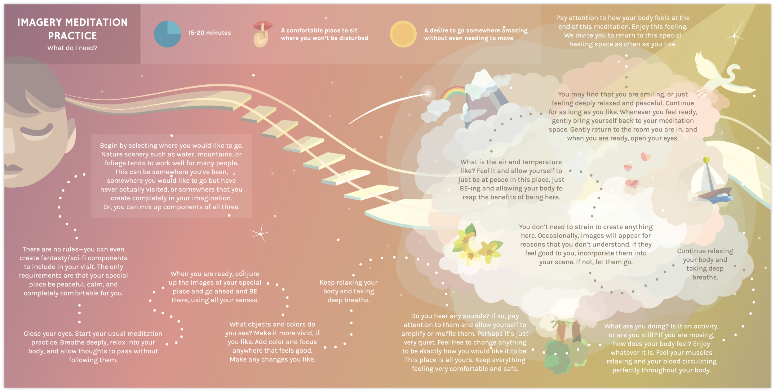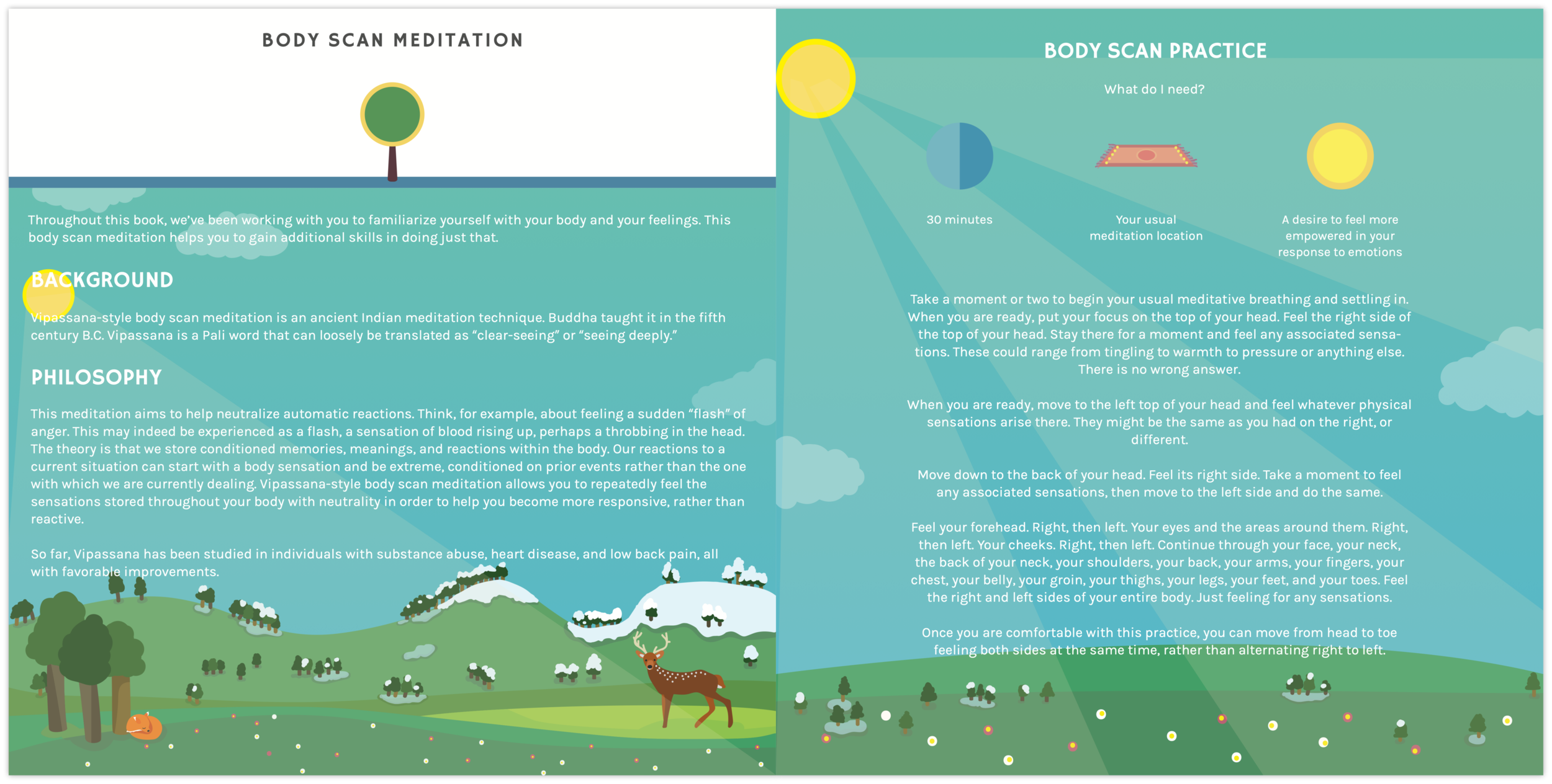 design and illustrations for a how-to guide on whole body approaches to health, ranging from healthy eating practices to meditation and mindfulness techniques